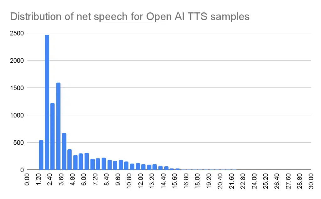 Pindrop’s researchers generated 10,000 audio samples using OpenAI 2022 TTS Voice Engine’s six pre-made voices with both the models provided by OpenAI, the standard “tts-1” model and the “tts-1-hd” model. Pindrop’s dataset of 10,000 generated audio samples has an average duration of 4.74 seconds of net speech per sample. The figure below plots the distribution of the net speech.