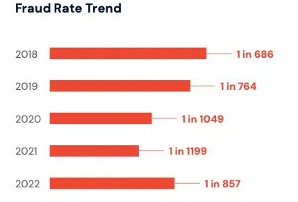 According to Pindrop’s intelligence, the trend of declining fraudulent activity within our client base began in early Q2 2020 and lasted through all of 2021. However, things began to change in 2022. The first quarter in 2022 saw a 35% increase in fraud attacks compared with the last quarter in 2021 and by the end of 2022, 1 in 857 calls analyzed by Pindrop were identified as fraudulent. This represents a 40% increase in fraudulent activity compared with 2021. This rapid increase to pre-pandemic norms should alarm any financial institution without strong safeguards in place.