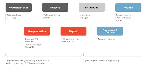 It’s also important to recognize that very likely, the fraudsters in question will make multiple calls accessing the target account. This activity typically originates in the IVR after PII has been successfully collected. Fraudsters will use IVR systems to conduct reconnaissance to validate the PII they have acquired matches to an account holder at the target institution along with monitoring the balances of the target accounts. This activity may escalate to the fraudster vishing the legitimate account holder, impersonating a CSR from the target institution, to collect answers to challenging KBA questions such as a verbal password or to have the legitimate account holder provide an OTP.