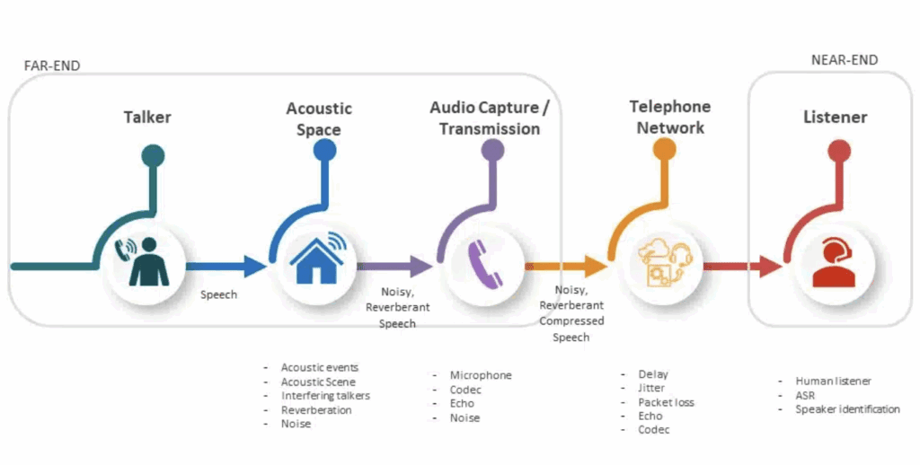Figure 1. A typical call-path for a speech signal from a talker to a listener highlighting many of the potential sources of degradation a speech signal may encounter in the transmission between a talker and a listener.