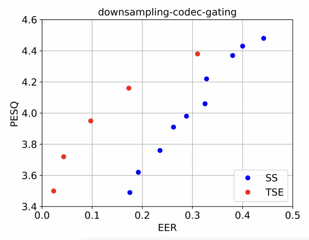 Figure 2. Quality measured in terms of PESQ vs performance quantified by the EER of the watermark detection for two commonly used watermarking techniques, spread-spread spectrum and time-spread echo, in the presence of call-path signal modifications (downsampling, codec at 8 kbps and noise gating).