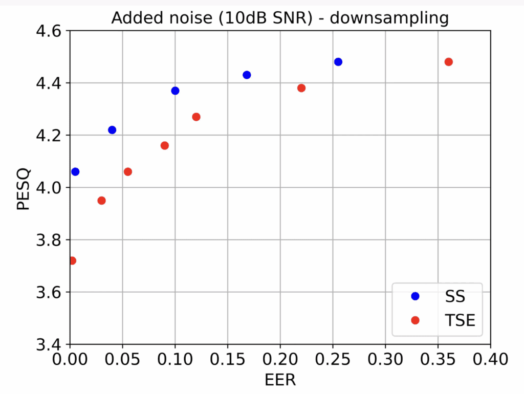 Figure 2 illustrates the balance between imperceptibility quantified by the perceptual evaluation of speech quality (PESQ) and watermark detection performance quantified by equal error rate (EER) for two commonly used watermarking methods: the spread-spectrum (SS) and the time-spread echo (TSE). The use of EER in watermark detection is the point where the false alarm rate (detecting a watermark when one is not present) and the false rejection rate (not detecting a watermark when one is present) are equal. For an imperceptible watermark of PESQ greater than 4 the typical performance is in the range of 15-30% EER. Note that both these methods achieve close to 0% EER even in attack types such as additive noise and resampling as shown in Fig. 3. In both cases the parameter that is varied is the watermark strength which governs the tradeoff between quality and performance.