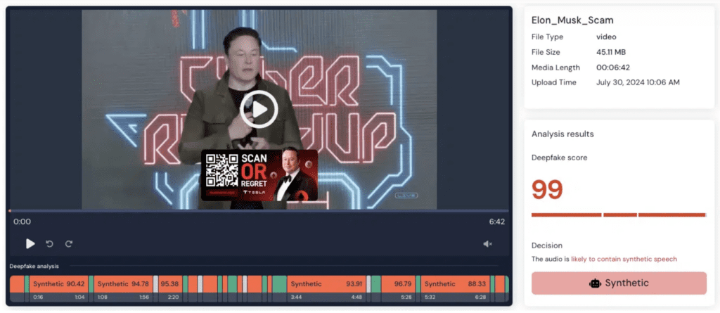 On Tuesday, July 23, 2024 at 10:30 pm ET, members of Pindrop’s research team discovered what appeared to be a live stream of Elon Musk on YouTube. We quickly determined that the live stream was actually a 6-minute 42-second AI-generated audio loop that mimics Elon Musk’s voice, discusses current U.S. politics and the 2024 election, and its potential effects on the future of cryptocurrency. The deepfake then urges the audience to scan a QR code, go to a “secure site,” and “effortlessly double” their cryptocurrency.