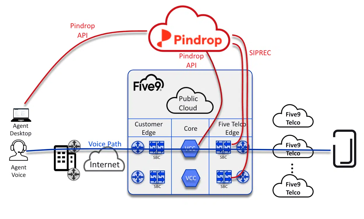 The diagram below showcases the powerful architecture behind the Five9 + Pindrop technology integration.