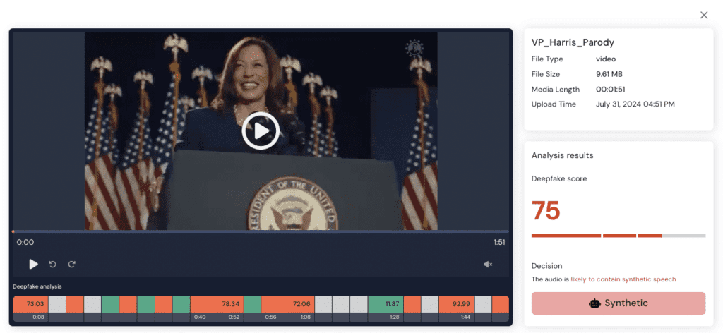 After denoising the audio to reduce the background music, Pulse detected fifteen 4-second segments as “synthetic” and six 4-second segments that were not synthetic, which leads us to believe that this is likely a partial deepfake. With Pulse’s liveness detection capability, our research team found three clips of VP Harris’s previous remarks in the parody video. Each clip, however, was removed from its original context. Listen below: