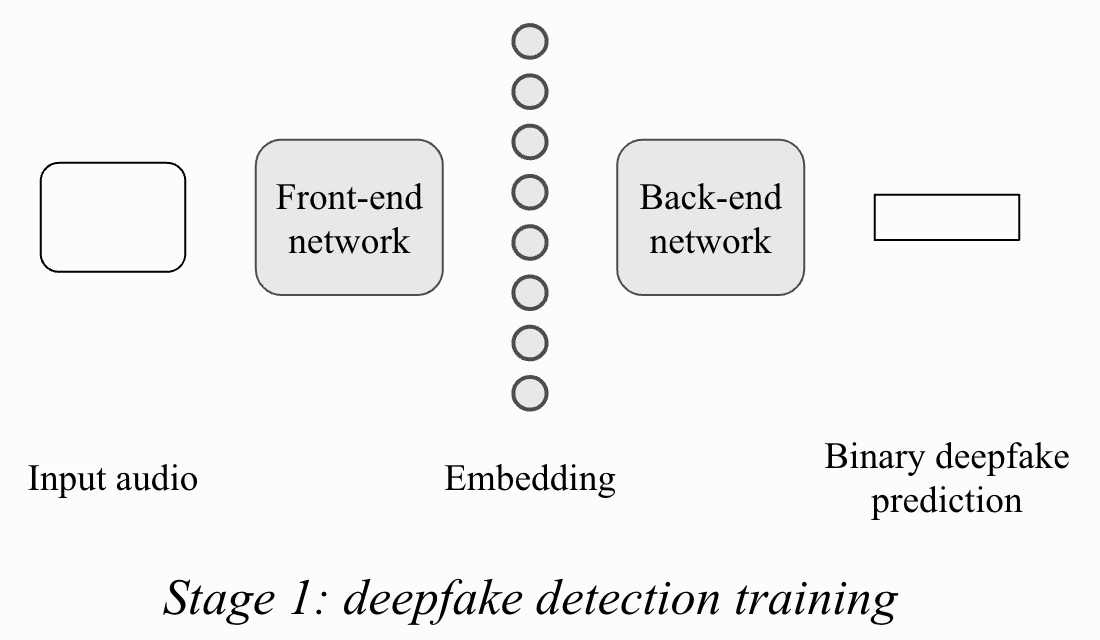 The two-stage approach splits training into two steps. First, a front-end model is trained for the standard binary deepfake detection task.