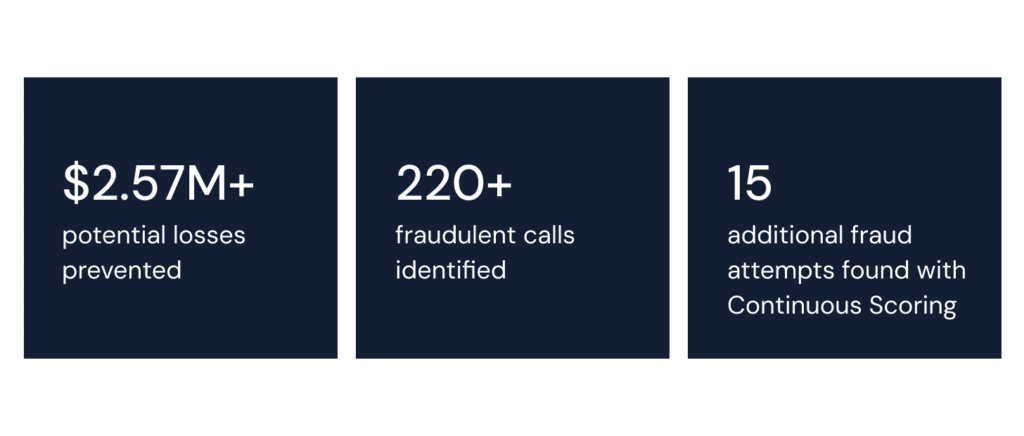 With Continuous Scoring, Pindrop added another layer of protection, uncovering 15 additional fraud attempts using advanced “look-back” analysis. This real-time intelligence continuously learns from confirmed fraud cases, applying new insights to both IVR and agent interactions. By detecting hidden reconnaissance activity early, the credit union closed security gaps and strengthened its defenses against future attacks.
