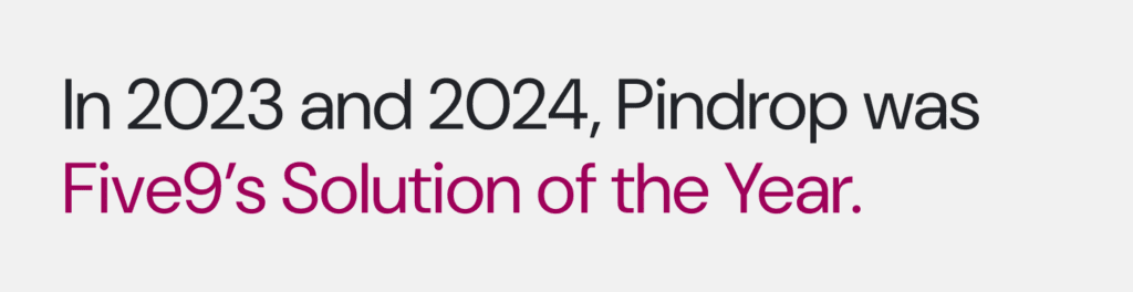 Since 2021, Pindrop and Five9 have partnered to deliver a best-in-class, pre-built integration that provides customers with passive authentication, fraud detection, and synthetic voice detection. Pindrop, recognized as Five9’s ISV solution of the year, continues to support a growing number of shared customers with Five9.